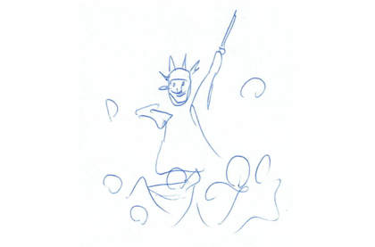Fotku sochy jsem černobílé vytisknul, vystřihnul, roztrhal, nalepil na barevný papír a naskenoval. Digitální obraz pak dál barevně upravuju. Jak pozadí, tak sochu. Do ní ještě přidávám starou mapu USA a vpisuji jména měst.